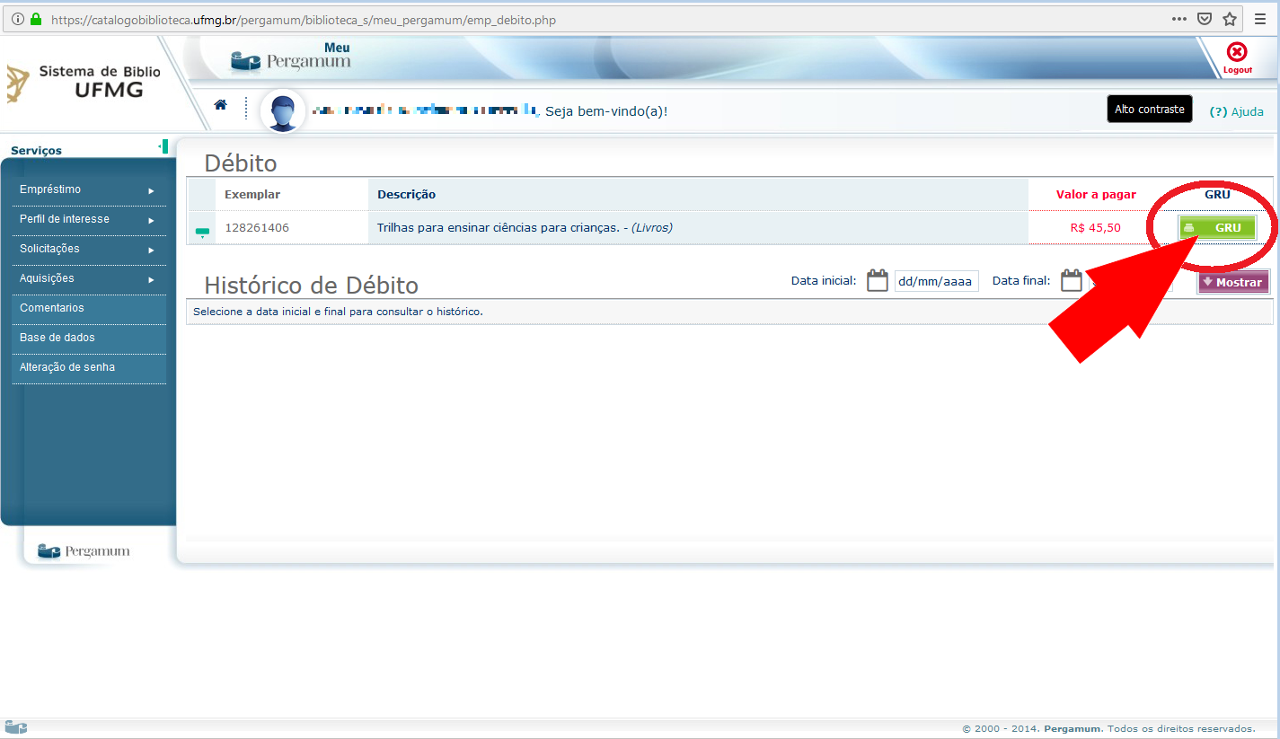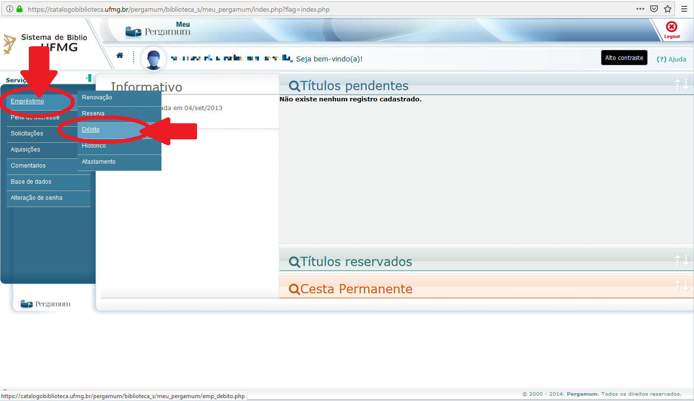 3.2) No campo usuário, digite o número da sua carteira única da UFMG, ou, 11 + seu número de matrícula. (Leia as informações na parte inferior da tela) 3.3) No campo senha, digite a senha que você utiliza para realização de empréstimos na biblioteca. (Atenção! não é a mesma senha utilizada no portal Minha UFMG) 4) Ao abrir a tela do sistema pergamum para usuários clique no menu "Empréstimo -> Débito".